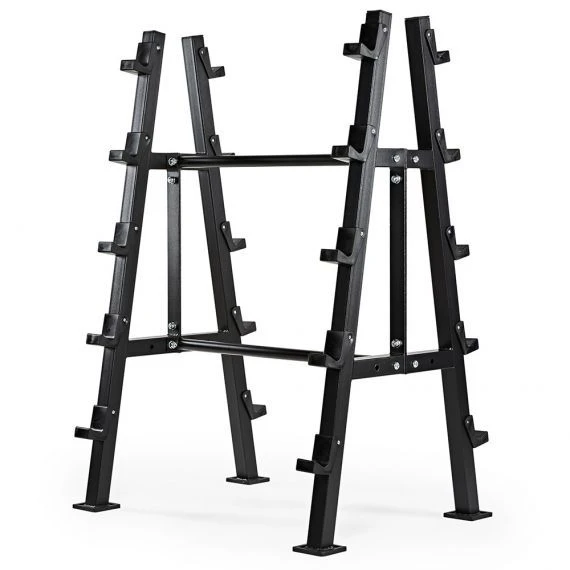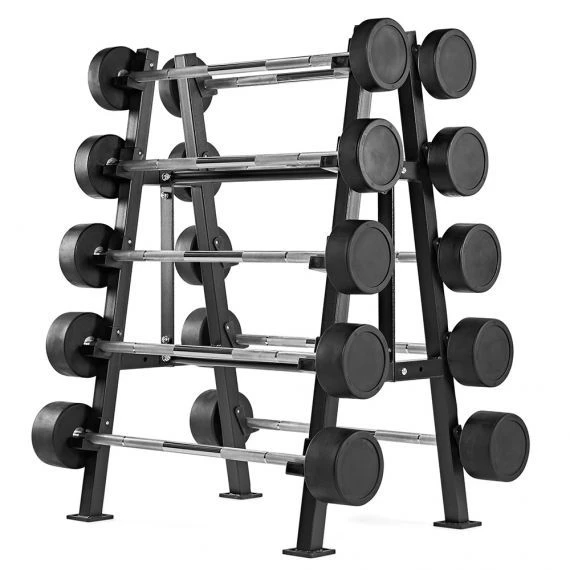 Free-standing barbell stand for storing 10 barbells.