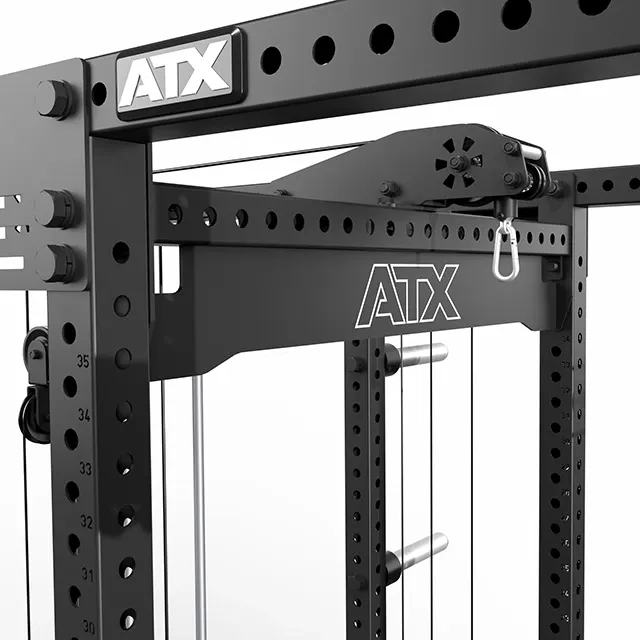 The ATX Monster Power Cage FCR-780 is a full power rack. It has a built-in weights storage extension. This makes it a cage. It also includes a cable crossover/ DAP, lat pulldown, and low row. With a 125 kg weight stack and flip-down spotters.