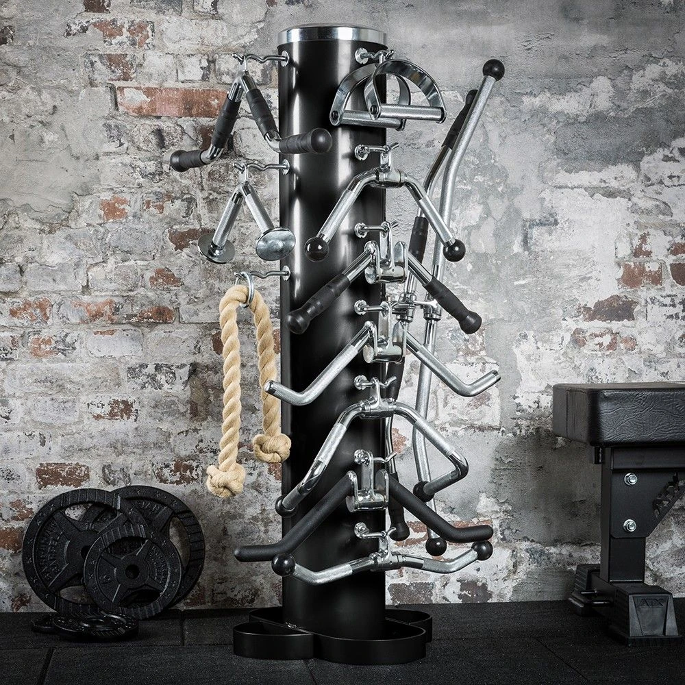 Vertical storage rack for gym cable handles. Cable handles sold separately.